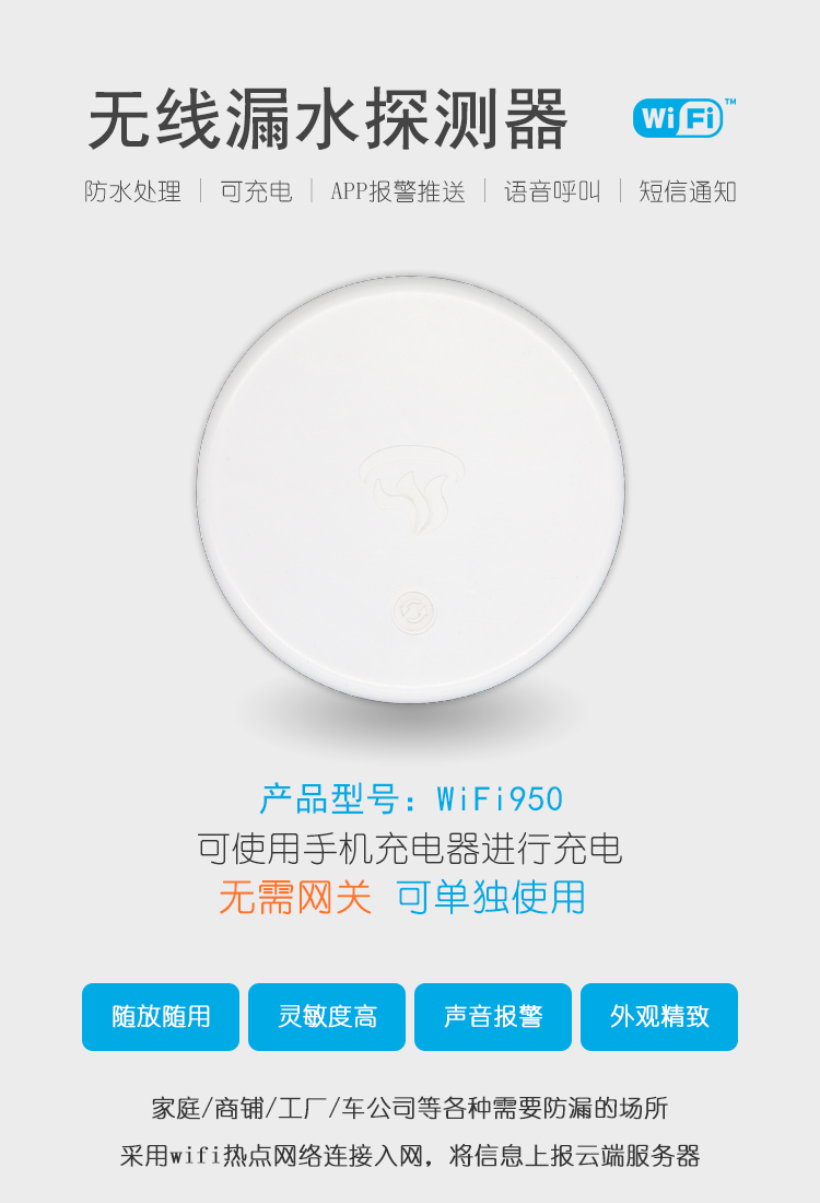 Product Description:本款WIFI型无线漏水探测报警器,防水等级达到IP67,可在5米深水下正常工作。采用家用无线网络传输方式,触控操作,可充电,可远程发送报警数据到手机APP,报警信息到手机,语音报警灯功能